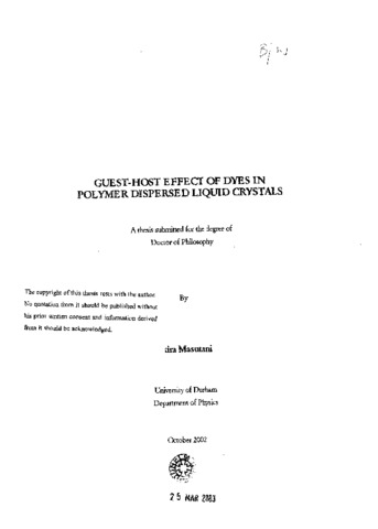 The guest-host [GH) effect of a tetracyanoquinodimethane (TCNQ) dye in nematic liquid crystals (LC) and polymer dispersed liquid crystals (PDLC) has been studied and compared with commercial azo and anthraquinone dyes. The adduct (MORPIP) is a conjugated molecule with a high dipole moment of 15 Debyes. E7 LC doped with MORPIP was found to give a dichroic ratio of 2.34 and an order parameter of 0.31; these values are lower than for the other dichroic dyes, typically 0.6 - 0.78. However, MORPIP showed a useful property When doped in LC and PDLC samples. The rise time of E7 was decreased by 21% when doped with 0.3 wt% MORPIP. It was suggested that MORPIP increased the dielectric anisotropy of E7 and hence reduced the rise time. Nevertheless, no change in dielectric anisotropy was observed. This observation favours a model in which the dipolar dopant reorients rapidly in the applied field and drives the reorientation of the surrounding LC The effects of the dyes incorporated in PDLGs were also studied, in order to explore their suitability for use in a colour reflective display. Dichroic PDLQ were made using the photo-initiated phase separation method. 0.37 wt7o MORPIP doped PDLCs showed a 45% faster response to an applied electric field than that of the undoped PDLCs. However, the contrast ratio of the dichroic PDLCs was not sufficiently high for display use due to insufficient scattering and dye trapping. Two new fabrication methods were developed to overcome this problem One method involved the preparation of a network type PDLC into which a doped LC was dispersed. Another method involved the preparation of voids by removing the LC from the PDLC In both methods, subsequent re-filling of the doped LC into the pre-made polymer matrix improved the contrast ratio and reduced the decay time of the dichroic PDLC