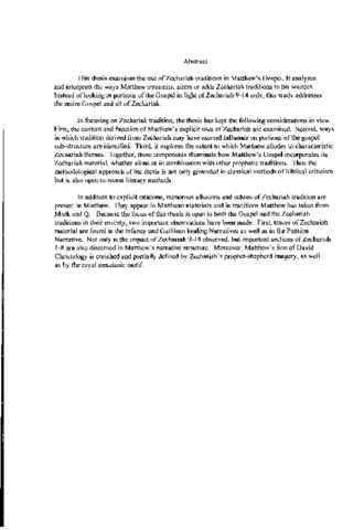 This thesis examines the use of Zechariah traditions in Matthew's Gospel. It analyzes and interprets the ways Matthew transmits, alters or adds Zechariah traditions to his sources. Instead of looking at portions of the Gospel in light of Zechariah 9-14 only, this study addresses the entire Gospel and all of Zechariah. In focusing on Zechariah tradition, the thesis has kept the following considerations in view. First, the content and function of Matthew's explicit uses of Zechariah are examined. Second, ways in which tradition derived from Zechariah may have exerted influence on portions of the gospel sub-structure are identified. Third, it explores the extent to which Matthew alludes to characteristic Zechariah themes. Together, these components illuminate how Matthew's Gospel incorporates its Zechariah material, whether alone or in combination with other prophetic traditions. Thus the methodological approach of the thesis is not only grounded in classical methods of biblical criticism but is also open to recent literary methods. In addition to explicit citations, numerous allusions and echoes of Zechariah tradition are present in Matthew. They appear in Matthean materials and in traditions Matthew has taken from Mark and Q. Because the focus of this thesis is open to both the Gospel and the Zechariah traditions in their entirety, two important observations have been made. First, traces of Zechariah material are found in the Infancy and Gaililean healing Narratives as well as in the Passion Narrative. Not only is the impact of Zechariah 9-14 observed, but important sections of Zechariah 1-8 are also discerned in Matthew's narrative structure. Moreover, Matthew's Son of David Christology is enriched and partially defined by Zechariah's prophet-shepherd imagery, as well as by the royal messianic motif.