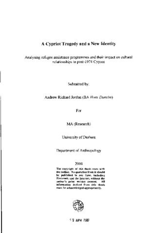A Cypriot tragedy and a new identity: analysing refugee assistance programmes and their impact on cultural relationships in post-1974 Cyprus.
