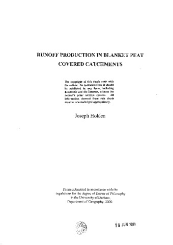 Although blanket peat covers many major headwater areas in Britain, runoff production within these upland catchments is poorly understood. This thesis examines runoff production mechanisms within the blanket peat catchments of the Moor House National Nature Reserve, North Pennines, UK. Catchments ranging from 11.4 km^ down to the hillslope and plot-scale are examined. Runoff from the monitored catchments was flashy. Lag times are short and rainwater is efficiently transported via quickflow- generating mechanisms such that flood peaks are high and low flows poorly maintained. Hillslope and plot-scale runoff measurements show that the flashy catchment response is the result of the dominance of overland flow. Typically 80 % of runoff is produced as overland flow. This occurs both on bare and vegetated surfaces. Most of the remaining runoff is generated from the upper 10 cm of the peat, except where well-connected macropore and pipe networks transfer flow through the lower layers. Below 10 cm depth the blanket peat matrix fails to contribute any significant runoff Thus most groundwater-based models of peat hydrological process are not readily applicable to these catchments.Suggestions that infiltration-excess overland flow may be largely responsible for the flashy regime of these upland catchments are not substantiated by the blanket peat infiltration data presented in this thesis. Monitoring of hillslope runoff mechanisms combined with rainfall simulation (at realistic intensities of 3-12 mm hr(^-1)) and tension- infiltrometer experiments shows that saturation-excess mechanisms dominate the response. Infiltration is relatively rapid in the upper peat layers until they become saturated and overland flow begins. High water tables result in rapid saturation of the peat mass such that even at low rainfall intensity runoff production is just as efficient as during high intensity events. While macropores have largely been ignored in blanket peat, results presented suggest that up to 30 % of runoff may be generated through them. Occasionally these macropore networks develop through the deeper peat such that runoff bypasses the matrix and runs off at depth from small outlets and larger pipe networks. Seasonal variations in runoff- generating processes can be exacerbated by drought which causes structural changes to the near-surface of the peat. This was found to result in enhanced infiltration and macropore flow which may encourage pipe network development. Flow has been monitored simultaneously from several natural pipes in a 0.4 km(^2) headwater catchment of the Tees. This catchment provides one of the few examples of pipeflow monitoring outside the shallow peaty-podzols of mid-Wales. Natural pipes are found throughout the soil profile and can be at depths of up to three metres. Ground penetrating radar was useful in identifying deep subsurface piping and suggestions are made for improvements to the application. The pipe networks were found to be complex and results demonstrate that outlet location and size may bear little relation to the form and depth of the pipe a short distance upslope. Pipes generally contribute less than 10 % to catchment runoff but on the rising and falling hydrograph limbs can contribute over 30 % to streamflow. Pipeflow lag times are short suggesting that both the shallow and deep pipes may be well connected to the surface. Thus while matrix runoff contributions at depth within the peat may be low, macropore flow mechanisms can be significant.