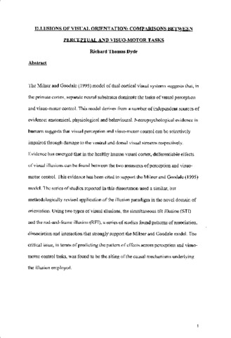 The Milner and Goodale (1995) model of dual cortical visual systems suggests that, in the primate cortex, separate neural substrates dominate the tasks of visual perception and visuo-motor control. This model derives from a number of independent sources of evidence: anatomical, physiological and behavioural. Neuropsychological evidence in humans suggests that visual perception and visuo-motor control can be selectively impaired through damage to the ventral and dorsal visual streams respectively. Evidence has emerged that in the healthy human visual cortex, differentiable effects of visual illusions can be found between the two measures of perception and visuo- motor control. This evidence has been cited to support the Milner and Goodale (1995) model. The series of studies reported in this dissertation used a similar, but methodologically revised application of the illusion paradigm in the novel domain of orientation. Using two types of visual illusions, the simultaneous tilt illusion (STI) and the rod-and-frame illusion (RFI), a series of studies found patterns of association, dissociation and interaction that strongly support the Mihier and Goodale model. The critical issue, in terms of predicting the pattern of effects across perception and visuo-motor control tasks, was found to be the siting of the causal mechanisms underlying the illusion employed.