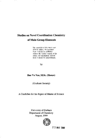 The studies described are mainly concerned with phosphorus coordination chemistry, and coordination chemistry of main group elements with bulky electron-withdrawing ligand. They may be divided into three parts. Part 1. Identification of new phosphorus specie This project continued the work that had been done in previous student projects, by carrying out a series of reactions of phosphoms(III) halides (X= CI, Br, I) with thiophosphorus(V) halides (X= CI, Br) and zinc dust present, to form several new products. Heating was generally used to increase the rate of reaction. The new phosphorus species can be classed into four kinds. A: Mixed valence phosphorus(III) -thiopho'sphorus(V) halides. B: New dithiophosphorus(V) halides. C: the new triphosphorus(III) halide PI(_2)PIPI(_2). (the first report of this compound). D: Mixed valence phosphorus(III) - dithiophosphorus(V) halides. (^31)P NMR studies have been used extensively throughout the project to identify the products. Part 2. Studies on main group elements compounds containing bulky electron-withdrawing substituents This project has involved reacting ArLi or Ar'Li, Ar"Li(Ar=2,4,6-(CF(_3))(_3)C(_6)H(_2); Ar'=2,6-(CF(_3))(_2)C(_6)H(_3); Ar"=2, 4-(CF(_3))(_2)C(_6)H(_3)) with ECI(_3), (E= As or P) or E'Cl(_4) (E'= Sn, Ge or Si) to synthesise new compounds, SiR(_2)Cl(_2), GeR(_2)Cl(_2). GeArCls, SnR(_2)Cl(_2). ASR(_2)CI, AsArCl(_2) and the previously described PRCl(_2) (R= Ar , Ar' or Ar"). All these new compounds have been characterised by elemental analysis and (^19)F NMR; the molecular structures of SnAr(_2)Cl(_2), SnAr'(_2)Cl(_2). GeAr"(_2)Cl(_2). GeArCb and SiAr"(_2)Cl(_2) have been elucidated by X-ray diffraction. Part 3. Attempt to synthesise phosphaalkynes with bulky electron-withdrawing substituents Attempts have been made to synthesise the first phosphaalkynes containing a bulky electi-on-withdrawing ligand; this involves a series of reactions, the first being the preparation of die phosphaalkene RP=CCl(_2). A few methods have been tested, but due to limit of time and other factors, the compounds could not be synthesized successfully so far.