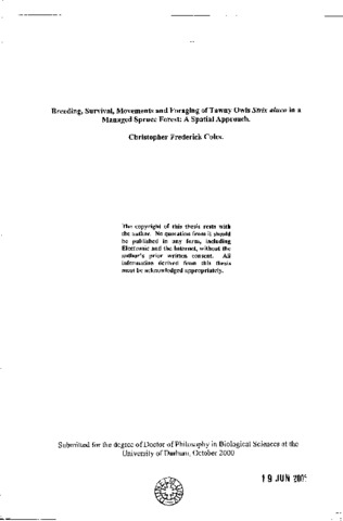 In 1996-98,1 studied the spatial ecology of the tawny owl Strix aluco (L.) in Kielder, a managed spruce forest in Northumberland, northern England. I employed radio tracking in an individual-based approach, estimating densities of field voles Microtus agrestis, the owl's main prey in Kielder Forest, using a calibrated sign index. In both 1996, a low vole year, and 1997, an increasing vole year, juvenile mortality was high, and largely due to starvation and predation. 55.4% of the variation in the mean number of days survived post-fledging per brood was explained by a model comprising the variables mean clutch hatch date, brood size, and voles per hectare at the clear-cuts nearest natal nest boxes in the spring of breeding. Nine percent of non radio tagged juveniles were recruited in 1997-98, in comparison with none of the radio marked individuals. Post onset of dispersal, vole abundance explained 25.7% of the variation in the time that juveniles spent in different areas. Juveniles did not become more sedentary over time nor avoided roosting in occupied territories. Adult home ranges contained more grassy areas than expected from their abundance in the study area, but not from their abundance at watershed level. The absolute areas of grassy habitat and lengths of habitat edge that were included in home ranges varied widely. Range area was correlated with distance to the nearest clear-cut, but not with variation in estimated vole abundance. Nocturnal activity centred on clear-cuts, other grassy areas, and mature forestry plantations. Field voles constituted 59% of prey deliveries to two nest boxes. The time that owls spent at clear-cuts was not correlated with estimated vole abundance there. Tawny owls are generalist predators, but their spatial ecology was strongly influenced by the abundance of their main prey species and the distribution of habitats that supported it.