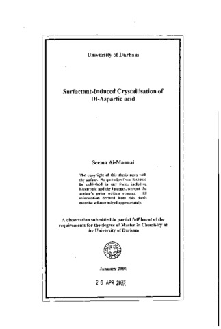 crystal faces were the main crystal faces that grew beneath all the films. External reflection FTIR was shown to be a good method of studying crystallisation beneath films, because peaks due to the film and dl-aspartic acid crystals can be seen. FTIR evidence of film reorganization during dl-aspartic acid crystallisation was found for the stearic acid, methyl stearate and nylon 6 6 films (spread from phenol-toluene). The FTIR data suggested that the nylon 6 6 and l-tyrosine monolayer films nucleated dl-aspartic acid crystals at earlier times compared with the other films.