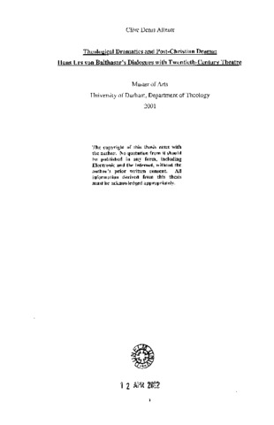 Theological dramatics and post-Christian drama: Hans Urs von Balthasar's dialogues with twentieth-century theatre