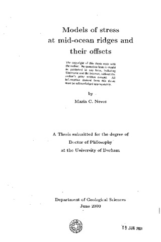 This thesis aims to investigate the stresses at mid-ocean ridge offsets, and particularly at the particular class of offsets represented by oceanic microplates. Amongthese, the Easter microplate is one of the best surveyed. This thesis first studies the stress field associated with mid-ocean ridges and simple types of ridge offsets, and then uses the stress field observed at Easter to constrain the driving mechanism of microplates. Two-dimensional finite element modelling is used to predict the lithospheric stress indicators, which are then compared with observations. Extensional structures at high angles (> 35 ) to ridge trends are often observed at ridge-transform intersections and non-tranform offsets, but remained unexplained until now. This study proposes that the topographic loading created by the elevation of mid-ocean ridges relative to old seafloor is a source of ridge parallel tensile stresses, and shows they can be explained by the rotation of ridge parallel tensile stresses at locked offsets. The elasto-plastic rheology is used to investigate the evolution of normal faults near mid-ocean ridges. It is shown that variations in the lithospheric strength, caused entirely by variations in the brittle layer thickness, can account for the observed variations in fault character with spreading rate and along-axis position. Plasticity is shown to prevent the achievement of large fault throws in thin brittle layers. Consequently, it may be important at fast spreading ridges. A new dynamic model is proposed for Easter microplate. It mainly consists of: 1) driving forces along the East and West Rifts, resulting from the combination of a regional tensile stress with an increasing ridge strength towards rift tips, 2) mantle basal drag resisting the microplate rotation, and contributing with less than 20% to the total resisting torque, and 3) resisting forces along the northern and southern boundaries. To explain both the earthquake focal mechanism evidence and theexistence of compressional ridges in the Nazca plate, the boundary conditions alongthe northern boundary are required to change with time, from completely locked tolocked in the normal direction only. This study does not invalidate the microplate kinematic model proposed by Schouten et al. (1993), but shows that normal resisting forces along the northern and southern boundaries of Easter microplate must exist in order to explain the stress observations. Also, it suggests that ridge strength variations play an important role in the dyamics of mid-ocean ridge overlap regions.