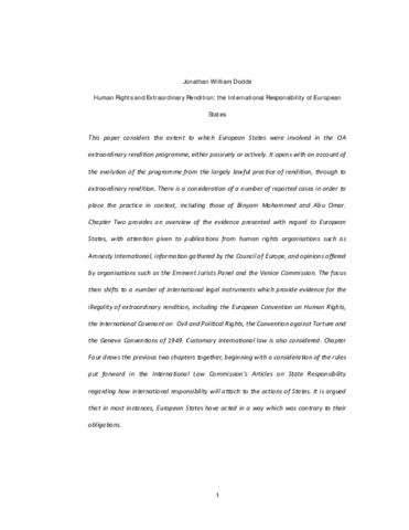 This paper considers the extent to which European States were involved in the CIA extraordinary rendition programme, either passively or actively. It opens with an account of the evolution of the programme from the largely lawful practice of rendition, through to extraordinary rendition. There is a consideration of a number of reported cases in order to place the practice in context, including those of Binyam Mohammed and Abu Omar. Chapter Two provides an overview of the evidence presented with regard to European States, with attention given to publications from human rights organisations such as Amnesty International, information gathered by the Council of Europe, and opinions offered by organisations such as the Eminent Jurists Panel and the Venice Commission. The focus then shifts to a number of international legal instruments which provide evidence for the illegality of extraordinary rendition, including the European Convention on Human Rights, the International Covenant on Civil and Political Rights, the Convention against Torture and the Geneva Conventions of 1949. Customary international law is also considered. Chapter Four draws the previous two chapters together, beginning with a consideration of the rules put forward in the International Law Commission’s Articles on State Responsibility regarding how international responsibility will attach to the actions of States. It is argued that in most instances, European States have acted in a way which was contrary to their obligations.