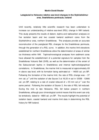 Until recently, relatively little scientific research has been undertaken to increase our understanding of relative sea-level (RSL) change in NW Iceland. This study presents the results of diatom, tephra and radiocarbon analyses on five isolation basin and two coastal lowland sediment cores from the Stykkishólmur area, northern Snæfellsnes. The analyses provide an accurate reconstruction of the postglacial RSL changes for the Snæfellsnes peninsula, through the generation of a RSL curve. In addition, the marine limit elevations established for northern Snæfellsnes allow the determination of areas of similar ice thickness within NW. Tephrochronological analyses from sediment cores have allowed the establishment of a potential signature for samples from the Snæfellsnes Volcanic Belt (SVB), as well as the determination of the extent of the Saksunarvatn tephra in Snæfellsnes and internal tephrostratigraphical correlations. In Snæfellsnes, the marine limit is measured at approximately 69 m above sea level, with its formation being estimated at ~ 14000 cal. yrs BP. Following the formation of the marine limit, the rate of RSL change was – 37 mm cal. yr-1 until the isolation of site Saurar 3 at 16.20 m asl in 12558 - 12646 cal. yrs BP, relating to a rate of crustal rebound of + 55 mm cal yr-1 over the same period. Following the isolation of Saurar 3, the rate of RSL fall reduced. During the mid- to late Holocene, RSL fell below present in northern Snæfellsnes, although poor chronological control means that this event can only be tentatively dated to~ 4800 cal. yrs BP. The results highlight the potential of isolation basin, coastal lowland and marine limit data in determining the RSL history for NW Iceland.