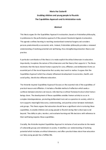 This thesis argues for the Capabilities Approach in education, based on Aristotelian philosophy, in preference to the performative approach of the present Standards Agenda in education. This agenda confines learning to reaching standardised numerical targets and considers persons predominantly as economic units. Instead, Aristotelian philosophy provides a renewed understanding of realising potential and well-being, thus strengthening education theory and practice. A particular contribution of the thesis is to make explicit the ethical dimension in education. Importantly, it explains the nature of this dimension and the theory that supports it. The thesis maintains that the basic shared human capacity for care, affiliation, and deliberation forms an essential part of the moral imperative that society must work to realise. It argues that the Capabilities Approach which has already influenced development in economics, health, and social policy, should also influence education. The Aristotle-inspired Capabilities Approach focuses on the essential role of the capabilities of practical reason and affiliation. It includes a flexible method of reflection which seeks a synthesis between emotion and reason, informed by an ethical framework about what human beings share. The development of these capabilities enables human activity to occur in complex interdependence, promoting deliberated trust and co-operation in society, which in turn supports meaningful discourse, understanding, and positive action between individuals and groups. This thesis argues that education should have a significant role in nurturing these capabilities, to enable children and young people to flourish during their school years and beyond. The ability to plan, monitor, and evaluate learning and life decisions with reference to their well-being requires these capabilities. Crucially, the Aristotle-inspired Capabilities Approach is inclusive of and sensitive to the needs of vulnerable groups and individuals in society. It redefines our understanding of realising potential which includes an ethical dimension, and offers practical ideas about how education can help young people live a fulfilled life.