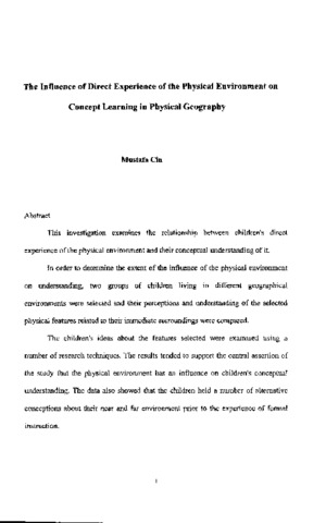 This investigation examines the relationship between children's direct experience of the physical environment and their conceptual understanding of it. In order to determine the extent of the influence of the physical environment on understanding, two groups of children living in different geographical environments were selected and their perceptions and understanding of the selected physical features related to their immediate surroundings were compared. The children's ideas about the features selected were examined using a number of research techniques. The results tended to support the central assertion of the study that the physical environment has an influence on children's conceptual understanding. The data also showed that the children held a number of alternative conceptions about their near and far environment prior to the experience of formal instruction. The relevance of these conclusions for geographical education is presented. Suggestions are made to improve the quality of teaching and learning in physical geography. Fieldwork, hardware models, simulation activities and Information and Communication Technology (ICT) are suggested for use as teaching approaches. The significance of the conclusions in the context of Turkish geographical education are also considered.
