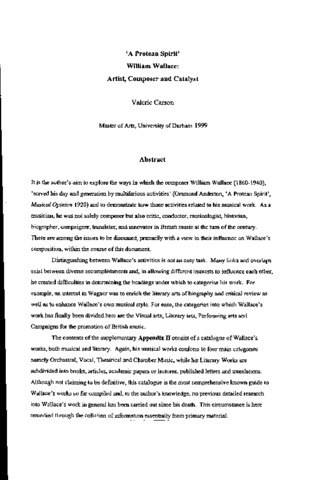 It is the author's aim to explore the ways in which the composer William Wallace (1860-1940), 'served his day and generation by multifarious activities' (Orsmond Anderton, 'A Protean Spirit’, Musical Opinion 1920) and to demonstrate how those activities related to his musical work. As a musician, he was not solely composer but also critic, conductor, musicologist, historian, biographer, campaigner, translator, and innovator in British music at the turn of the century. These are among the issues to be discussed, primarily with a view to their influence on Wallace’s composition, within the course of this document. Distinguishing between Wallace's activities is not an easy task. Many links and overlaps exist between diverse accomplishments and, in allowing different interests to influence each other, he created difficulties in determining the headings under which to categorise his work. For example, an interest in Wagner was to enrich the literary arts of biography and critical review as well as to enhance Wallace's own musical style. For ease, the categories into which Wallace’s work has finally been divided here are the Visual arts. Literary arts. Performing arts and Campaigns for the promotion of British music. The contents of the supplementary Appendix n consist of a catalogue of Wallace’s works, both musical and literary. Again, his musical works conform to four main categories namely Orchestral, Vocal, Theatrical and Chamber Music, while his Literary Works are subdivided into books, articles, academic papers or lectures, published letters and translations. Although not claiming to be definitive, this catalogue is the most comprehensive known guide to Wallace’s works so far compiled and, to the author's knowledge, no previous detailed research into Wallace's work in general has been carried out since his death. This circumstance is here remedied through the collation of information essentially from primary material.