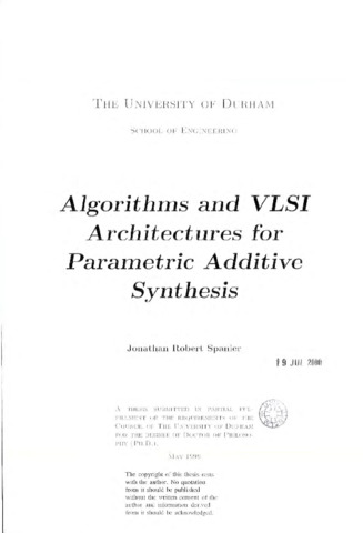 A parametric additive synthesis approach to sound synthesis is advantageous as it can model sounds in a large scale manner, unlike the classical sinusoidal additive based synthesis paradigms. It is known that a large body of naturally occurring sounds are resonant in character and thus fit the concept well. This thesis is concerned with the computational optimisation of a super class of form ant synthesis which extends the sinusoidal parameters with a spread parameter known as band width. Here a modified formant algorithm is introduced which can be traced back to work done at IRCAM, Paris. When impulse driven, a filter based approach to modelling a formant limits the computational work-load. It is assumed that the filter's coefficients are fixed at initialisation, thus avoiding interpolation which can cause the filter to become chaotic. A filter which is more complex than a second order section is required. Temporal resolution of an impulse generator is achieved by using a two stage polyphase decimator which drives many filterbanks. Each filterbank describes one formant and is composed of sub-elements which allow variation of the formant’s parameters. A resource manager is discussed to overcome the possibility of all sub- banks operating in unison. All filterbanks for one voice are connected in series to the impulse generator and their outputs are summed and scaled accordingly. An explorative study of number systems for DSP algorithms and their architectures is investigated. I invented a new theoretical mechanism for multi-level logic based DSP. Its aims are to reduce the number of transistors and to increase their functionality. A review of synthesis algorithms and VLSI architectures are discussed in a case study between a filter based bit-serial and a CORDIC based sinusoidal generator. They are both of similar size, but the latter is always guaranteed to be stable.