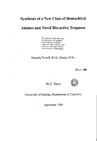 This thesis describes two main programmes: the synthesis of a new class of homochiral amines and the synthesis of ketone analogues of 3a-esterified tropane alkaloids. In chapter one, a scaled-up synthesis of (5)-a-(diphenylmethyl)pyrrolidine 1 is described. The key hydrogenation step of the oxazolidinone intermediate 2 was extended to the synthesis of the other chiral amines 70, 73, 76, 79 and 82. Hydrogenation of the oxazolidinones proceeded in good yields (71 - 87 %) and was not susceptible to racemisation. Thus, a convenient route from amino acid ester hydrochlorides (S)-valine 65, (S)-phenylalanine 66, (S)-alanine 67, (S)-isoleucine 68 and (S)-leucine 69 allowed a range of novel chiral amines to be prepared. In chapters two and three, a new route to ketone analogues of tropane esters is described. In chapter two, results of an attempt to prepare ketone 110 are outlined. Ketone 110 is an analogue of the tropane alkaloid littorine 101, where the bridging ester O atom is replaced by a CH2 group. The first approach to ketone 110 involved the Wittig reaction of acetylmethylenephosphorane 118 and the Homer-Wadsworth- Emmons reaction of diethylbenzoylmethanephosphonate 122 with tropinone 116. Tropinone 116 was found to be particularly unreactive in both cases. The second approach to ketone 110 involved the coupling reactions of both N-troc-3a- tosyloxymethyltropane 170 and N-troc-3 a-iodomethyltropane 185 with 2-phenylacetyl- 1,3-dithiane 147 and 1,3-ditihiane 142. These were also unreactive and as a result the synthesis of ketone 110 remains unresolved. In chapter three, the synthesis of other ketone analogues of naturally occurring 3 a- esterified tropane alkaloids is described. A six-step route to the ketones was devised and in this route the Grignard reactions of tropan-3 -ylacetaldehyde 227 emerged as the key to the success of the strategy. Three ketone analogues 218, 219 and 220 of tropate esters were successfully prepared. Ketone 220, the analogue of apoatropine 201, was found to be a muscarinic acetylcholine receptor antagonist (EC(_50) 1.9x10(^-7) M) in guinea-pigileum, showing a 500-fold less activity than atropine 202. However the activity is still within the clinical range.
