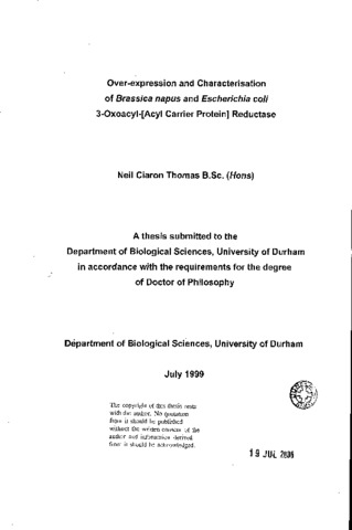 Over-expression and characterisation of Brassica napus and Escherichia coli 3-oxoacyl-[acyl carrier protein] reductase