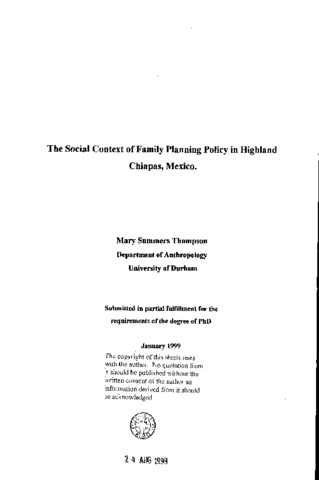 This thesis focuses on the concept of informed choice in family planning and how numerical and systematic targeting aimed at raising the numbers of contraceptive acceptors fundamentally undermines this concept in highland Chiapas. The Government of Mexico’s policy aims within its Reproductive Health Programme (1995-2000) are to reduce the total fertility rate whilst promoting reproductive health services and family planning choices. Though Mexico has seen a decline in its total fertility rate attributed to increased contraceptive use in urban areas, in rural parts the rate remains high. Consequently, the rural poor, and in Chiapas overwhelmingly indigenous populations, have become a major target of the Reproductive Health Programme. Monthly targets are set for clinics and family planning services are offered systematically every time a woman attends a clinic for whatever reason. Amongst the factors which must be accounted for in assessing family planning provision in highland Chiapas are cultural differences between mestizo providers and the indigenous target groups as well as local economic and political conditions. Presently, the state of Chiapas is highly militarised and under the cloud of a low intensity war precipitated by the Zapatista uprising in 1994. The provision of any kind of health services is difficult under these situations, but more so what one considers the distrust sown between some indigenous communities and the government Who provide the health services. This thesis examines the practicalities of implementing a global policy at a local level and the constraints faced by both providers and intended recipients in the social context of Los Altos. Mindful of the care required in identification most people in this thesis (with the exception of a few well-known academics) appear under pseudonyms.