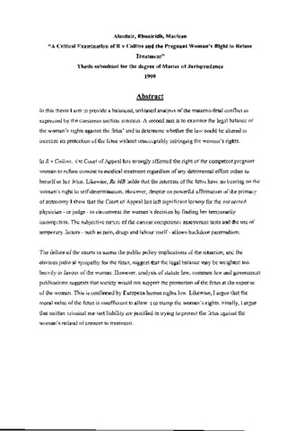 In this thesis I aim to provide a balanced, unbiased analysis of the materno-fetal conflict as expressed by the caesarean section scenario. A second aim is to examine the legal balance of the woman's rights against the fetus' and to determine whether the law could be altered to increase its protection of the fetus without unacceptably infringing the woman's rights. In R v Collins, the Court of Appeal has strongly affirmed the right of the competent pregnant woman to refuse consent to medical treatment regardless of any detrimental effect either to herself or her fetus. Likewise, Re MB holds that the interests of the fetus have no bearing on the woman’s right to self-determination. However, despite its powerful affirmation of the primacy of autonomy I show that the Court of Appeal has left significant leeway for the concerned physician - or judge - to circumvent the woman's decision by finding her temporarily incompetent. The subjective nature of the current competence assessment tests and the use of temporary factors - such as pain, drugs and labour itself - allows backdoor paternalism. The failure of the courts to assess the public policy implications of the situation, and the obvious judicial sympathy for the fetus, suggest that the legal balance may be weighted too heavily in favour of the woman. However, analysis of statute law, common law and government publications suggests that society would not support the protection of the fetus at the expense of the woman. This is confirmed by European human rights law. Likewise, I argue that the moral value of the fetus is insufficient to allow it to trump the woman's rights. Finally, I argue that neither criminal nor tort liability are justified in trying to protect the fetus against the woman’s refusal of consent to treatment.
