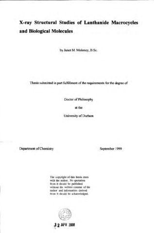 The work described in this thesis is broadly divided into two sections. The structural study on the lanthanide macrocyclic complexes was afforded by means of X-ray crystallography In this chapter, the molecules dota, the cationic enantiopure tetraamide europium and dysprosium complexes, the sodium complexes of the tetranaphthylamide and quinoyl derivative, the enantiopure gadolinium and europium complexes of the tetraamide series with esteratic sidechains, the lanathanum and ytterbium complexes of the dota derivative with benzyl phosphinate sidechains, and the tetracarboxyethyl series both as three uncomplexed stereoisomer and complexes of the RRRR stereoisomer with europium, gadolinium and terbium. These complexes exhibit quite a lot of structural diversity. Chapter five deals with experiments carried out at ultra low temperatures. A phase transition that the molecule benzil undergoes is investigated on the Fddd diffractometer, a study of the interesting 1,12-dicarbonyl borane was undertaken to obtain precise values for the carbonyl bond lengths and the unprecedented structure of its hydrate was revealed to be a carbene diol and not the expected carboxylic acid complex The standard for macromolecular tests for diffraction, chicken egg white lysozyme, was crystallised and used to optimise conditions for low-temperature data acquisition from macromolecular samples The work described in this Thesis was carried out in the Department of Chemistry, Durham University from October 1995 to January 1999, under the supervision of Professor J.A.K. Howard. All of the work is my own, unless stated to the contrary, and it has not been submitted previously for a degree at this or any other university.