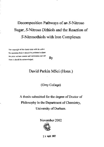 Decomposition pathways of S-nitroso-l-thio-β-D-glucose tetraacetate were studied at physiological pH (pH 7.4) and compared with other low molecular weight S-nitrosothiols. Three large differences in reactivity were observed. A larger than expected rate of reaction for the thermal decomposition and reaction with cysteine was found. The second order rate constant obtained for the copper catalysed decomposition was very small compared with other more reactive S-nitrosothiols. The decomposition pathways of the S-nitrosated derivatives of two 1,4 dithiols and a vicinal dithiol were studied. Rate of reaction via the thermal decomposition pathway v/as found to be much greater for the dinitrosated 1,4 dithiols than the dinitrosated vicinal dithiol. The mononitrosated 1,4 dithiols were found to be reasonably stable in acidic solution suggesting that an interaction between two S-nitroso groups on the same molecule could lead to a rapid decomposition. Conversely the mononitrosated vicinal thiol was found to decompose more rapidly than the analogous 1,4 dithiol compounds in acidic solution and at pH 7.4. The mononitrosated vicinal dithiol decomposed to form quantitative amounts of ammonia at pH 7.4. An interesting feature of the reactivity of the vicinal dithiol towards the i'-nitrosothiol functional group was that the thiol form appeared to be an effective nucleophile as well as the thiolate ion forms. Other thiols have a negligible reactivity, except when deprotonated. It has been found that 5-nitrosothiols can transfer NO to an iron(+2) dithiol complex and iron dithiocarbamate complexes at pH 7.4. The iron complexes all have a high affinity for NO in aqueous solution. Primary S-nitrosothiols were found to be able to transfer directly NO(^+) to the iron(+2) dithiol complex. However when S-nitrosoglutathione reacted with iron dithiocarbamate complexes NO appeared to be transferred. Evidence was also obtained that tertiary S-nitrosothiols could transfer NO to the iron(+2) dithiol complex. Clearly whether NO or NO(^+) is transferred depends on the nature of the S-nitrosothiol and the iron complex. Currently iron(+2) dithiocarbamate complexes are used to detect NO, these findings suggest that the presence of 5-nitrosothiols may compromise this experimental procedure.