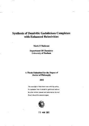 This thesis deals with the synthesis of dendritic gadolinium complexes based on DOTA, with a view to obtaining enhanced relaxivities. Li addition to the inherently long electronic relaxation time and high paramagnetic moment of the gadolinium (III) ion, the speed of rotation of its complexes in solution is a decisive parameter in the determination of the relaxivity. This parameter is dependent on the molecular mass of the complex. Initially, the enantioselective synthesis of novel a-substituted analogues of DOTA was attempted but was not successful due to difficulties encountered in attaining the tetraalkylation of cyclen and the purification of the products obtained. Therefore, further studies were carried out based on the known [Gd(gDOTA)]" system. The synthesis of three medium M(_W) dendrons, each with a focal primary amino group was carried out. Their structures may be described as dendrimeric analogues of poly(ethylene glycol). Two of these structures were successfully coupled to the gadolinium (III) chelate, [Gd.gDOTA]. The acid-catalysed epimerisation of the statistical distribution of stereoisomers yielded solely the (RRRR)/(SSSS) isomeric pair. This system had previously been shown to undergo fast water exchange. The coupling and deprotection procedure yielded paramagnetic dendritic complexes with molecular weights of 2013 and 3535.Relaxivity measurements were carried out on these systems and the results showed significantly higher relaxivities of 18 and 21 mM(^-1) s(^-1) respectively, compared with a value of 7.8 mM(^-1) s(^-1) for the parent compound. Examination of NMRD profiles for the larger system showed a decrease in the rotational correlation time to 310 ps at 298 K, as expected. However, this was accompanied by an increase in the inner-sphere water exchange lifetime to 570 ns at 298 K. Therefore, although an improvement in relaxivity was obtained through a coupling to the slower rotation of the system in solution, this enhancement was limited by the accompanying decrease in the rate of water exchange. The best fitting procedure of the NMRD profiling procedure revealed the presence of 8 second-sphere water molecules at an average distance of 4Å. The second sphere contribution was shown to be the dominant contributor to the overall relaxivity. This accounted for >50% of the increased relaxivity.