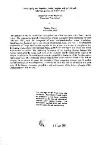 The Caspian Sea and its littoral have emerged as one of the key areas in the former Soviet Union. The region experienced a fundamental change in it geopolitical landscape between 1992 and 1997, with the emergence of three newly-independent states, Azerbaijan, Kazakhstan and Turkmenistan to join the old littoral states Russia and Iran. The subsequent re-discovery of large hydrocarbon deposits in the region has served to complicate the developing relationships between these states, and between the region as a whole and actors from outside the region. By examining the course of two ongoing disputes between the Caspian states, over the future legal status of the sea itself, and the export of the region's oil and gas via pipelines, the evolving and complex geopolitical landscape of the Caspian region will be described. The interaction of state and non-state actors and their interests will then be analysed in an attempt to gauge the strength of these competing interests and to predict possible outcomes of this competition. However, the topic will first be introduced by a brief study of the history of modern geopolitics, and a description of the history of some of the Caspian region's own history.