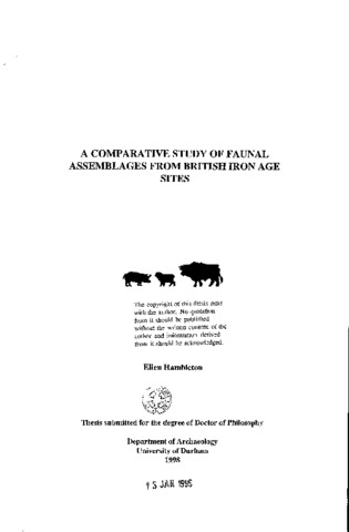 The broad aim of this thesis is to further understanding of British Iron Age animal husbandry regimes by undertaking a comparative study of faunal assemblages. More specifically, this involves development of a uniform methodology for comparing published faunal data in order to recognise inter and intra-regional patterns of animal husbandry. Lack of uniformity in methods of recording and presenting faunal data, together with variation in the quality and quantity of information published in reports, serves as a barrier to systematic quantitative comparison. This thesis therefore seeks to develop methods of comparison which utilise the most commonly available forms of faunal data, or convert different forms of data into a single comparable format, in order that inter and intra-regional analyses of the widest possible dataset can be undertaken. To ensure viable comparisons unaffected by small sample bias, only those sites with total cattle, sheep and pig assemblages of NISP>300 or MNI>30 are included in this study. Analyses concentrate on the three main domestic species (cattle, sheep, and pig) which comprise the bulk of all faunal remains recovered from excavations of British Iron Age sites, and utilise three main types of information: Firstly, representation of different skeletal elements is examined in order to recognise the effects of taphonomic and human alteration on each assemblage. Secondly, quantification data for cattle, sheep, and pig is compared, using tripolar graphs to establish the relative importance of different species in each assemblage. Thirdly, mandibular tooth wear data is used for the composition of mortality profiles to compare herd management strategies. Both species proportions and mortality profiles from different faunal assemblages are compared, and examined for any inter and intra-regional similarities. Subsequently assemblages are examined for relationships between patterns of species proportions and/or mortality profiles and particular site characteristics (topographical location, underlying geology, settlement type, and date). Finally, using the results of these analyses, suggestions are made as to the nature of animal husbandry regimes in different regions, and the factors influencing choice of husbandry strategy in Iron Age Britain.
