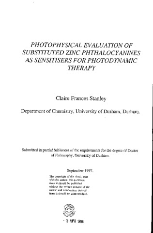 Zinc phthalocyanines (ZnPc) are currently being investigated in relation to their use as sensitisers for Photodynamic Therapy (PDT). In particular, the photophysical properties of these dyes are of interest since then- ability to generate the cytotoxic species, singlet oxygen ((^1)O(_2)), is believed to be central to their role in causing tumour necrosis. In this study, a detailed investigation of the photophysical properties of substituted zinc phthalocyanines under various conditions is described. Two novel β-tetra substituted zinc phthalocyanines have been synthesised, ZnPc(CMe(C0(_2)Me)(_2))(_4) and ZnPc(CHMeCO(_2)H)(_4). The nature of peripheral substituents has little effect on triplet state or singlet oxygen production by ZnPc, however, ZnPc(CHMeCO(_2)H)(_4) displays a remarkable sensitivity to the ionic strength of non aqueous solutions. Ion concentrations below 10(^-4) mol dm(^-3) induce dimerisation whilst concentrations greater than this promote monomerisation. This behaviour is attributed to ion pairing effects. Photophysical properties of substituted zinc phthalocyanines in heterogenous media and on solid substrates are also described. The temperature and pH of solvent media greatly influence the photophysical properties of phtiialocyanines. Octadecyl zinc phthalocyanine (C10) aggregates upon cooling to 77 K in ether-pentane-alcohol (5:5:2) solution. Additional structure in the absorption spectrum is observed, accompanied by the appearance of a fluorescence emission band at 760 nm. Aluminium phthalocyanine chloride in methanol dimerises upon addition of 2.5 x 10(^-5) mol dm(^-3) fluoride ions. Dimer species are characterised by a blue shifted peak in the absorption spectrum and are non-fluorescent. These results are ascribed to different aggregate geometries and discussed in terms of exciton theory. Low pH induces stepwise protonation of the azomethine bridges of the phthalocyanme ring, Pc + nH(^+) PcH(_n)(^n+)+, where n = 0 to 4. Protonation results in significant changes in absorption, fluorescence and triplet state properties of the phthalocyanine. A dramatic decrease in singlet oxygen generation by the phthalocyanine (ɸ∆ (n = 0) = 0.54, ɸ∆ (n = 1) = 0.075) is reported, and occurs under surprisingly mild conditions (pK(_a) of ZnPcS(_2) in 1% Triton X-100/H(_2)O = 4.4). The propensity of ZnPc's to bind to serum protein and to participate in electron transfer reactions with potential electron donors is discussed.