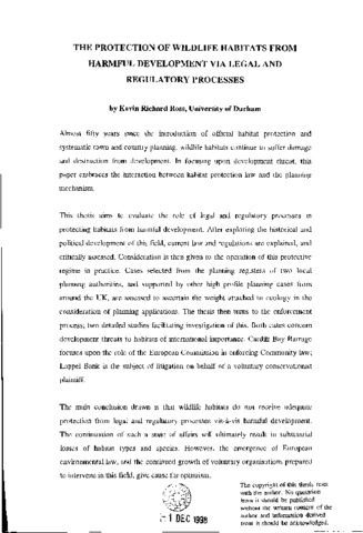 Almost fifty years since the introduction of official habitat protection and systematic town and country planning, wildlife habitats continue to suffer damage and destruction from development. In focusing upon development threat, this paper embraces the interaction between habitat protection law and the planning mechanism. This thesis aims to evaluate the role of legal and regulatory processes in protecting habitats from harmful development. After exploring the historical and political development of this field, current law and regulations are explained, and critically assessed. Consideration is then given to the operation of this protective regime in practice. Cases selected from the planning registers of two local planning authorities, and supported by other high profile planning cases from around the UK, are assessed to ascertain the weight attached to ecology in the consideration of planning applications. The thesis then turns to the enforcement process; two detailed studies facilitating investigation of this. Both cases concern development threats to habitats of international importance. Cardiff Bay Barrage focuses upon the role of the European Commission in enforcing Community law; Lappel Bank is the subject of litigation on behalf of a voluntary conservationist plaintiff The main conclusion drawn is that wildlife habitats do not receive adequate protection from legal and regulatory processes vis-à-vis harmful development. The continuation of such a state of affairs will ultimately result in substantial losses of habitat types and species. However, the emergence of European environmental law, and the continued growth of voluntary organisations prepared to intervene in this field, give cause for optimism.