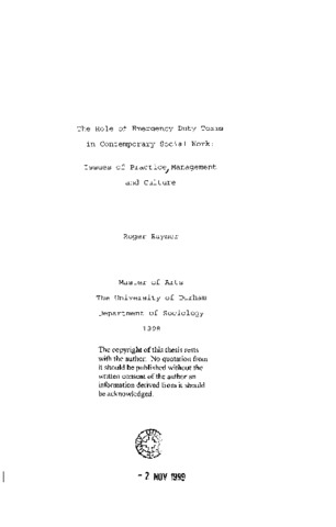 Emergency Duty Teams have been introduced into social services and social work departments throughout the previous two decades and are now recognised as an appropriate means of providing a field social work service "out of hours”. This thesis explores the manner whereby EDTs became an established part of local authority social work organisations placing them in some historical context. The thesis then explores contemporary issues of social work practice, supervision and training and attempts to weigh both the merits and potential difficulties of EDTs remaining as the last bastions of generic social work. The thesis explores the relationship between EDTs and their wider organisation and uses the concept of organisational culture as a means of trying to understand some of the paradoxes and stresses to which EDT workers frequently refer. The thesis then identifies and explores some of the contemporary issues which may well have influence upon the contemporary role and task of EDT, ranging from the macro issues of Europeanisation to micro issues of purchaser/provider split. The thesis concludes by cautiously attempting to predict the manner in which an out of hours social work service is likely to be made available both to individual service users and to organisations.