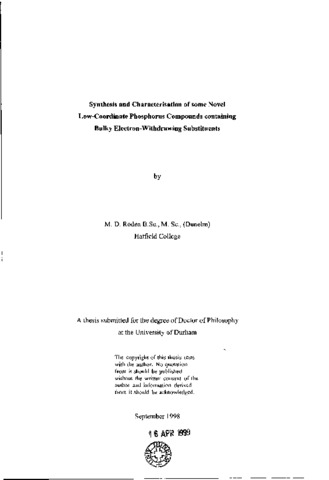 The synthesis of several new phosphorus derivatives including new monophosphanes of the type RPX(_2) (X = F, CI and H), containing either the Fluoromes [2,4,6-(CF(_3))(_3)C(_6)H(_2)] or Fluoroxyl [2,6-(CF(_3))(_2)C(_6)H(_3)] group has been carried out successfully. The synthesis of a number of Cis-Platin analogous has been facilitated by the reaction of these new monophosphanes with a platinum dimer [(PCl(_2)(Pet(_3))(_2)](_2). These compounds are of the type PtCl(_2)(Pet(_3))RPX(_2) (X = CI, H and F, R = 2,6- bis(trifluoromethyl)phenyl). These compounds have shown an interesting correlation between bond length and (^1)J(_p-pt) NMR coupling. Disubstituted phosphanes (RPX(_2), X = CI, H) have also been synthesised and subsequent reaction has facilitated the formation, characterisation and structure solution of a new phosphorus (I) species (RP(_2)(^(-)))(Ph(_3)PCH(_3))(^1) (R - Fluoromes).Attempts have been made to synthesise the first phosphaalkyne containing a bulky electron withdrawing ligand. This involved the reaction of RP=CCl(_2) (R = 2,6- bis(trifluoromethyl)phenyl) with a number of Pt(0) and Pd(0) species. (^31)P NMR studies have been used extensively throughout the project to help characterise and identify the products. The single crystal, solid state structures of many of the new species were elucidated by X-ray diffraction using a Siemens Smart CCD.