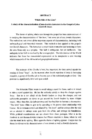 The theme of kpiσιϛ which runs through the gospel has been taken account of in studying the characterisation of "the Jews," but never yet of non-Jewish characters. The method set out covers all the important aspects of characterisation, including both anthropological and rhetorical interests. This method is then applied to the gospel's non-Jewish characters. The Samaritan woman's faith is tentative and hesitating at best; she sees Jesus only as a prophet. Her faith is ambiguous, but not ineffective. The ambiguity in her faith is resolved by the townspeople's. The title Saviour of the World indicates that Jesus has transcended expectations as he inaugurates a new worship which transcends all the old racial and geographical barriers. The pericope of the Greeks is brief, but important, for their arrival signals the coming of Jesus' "hour". At the moment when Jewish rejection of Jesus is becoming complete, a group of Gentiles ask to become part of the redefined people of God. The pericope is, significantly, brief and open-ended. The Johannine Pilate wants to avoid taking a stand for Jesus, and so is forced to take a stand against him. He has the authority simply to drop the charges against Jesus. But he is too afraid of the Jewish leaders to drop the charges, and not sufficiently perceptive or clever to get around the Jewish leaders by more oblique means. More than that, his indecisiveness and fear lead him to become a theomachos. "The Jews" force Pilate to give in by appealing to his patron-client relationship with Caesar. He is outmanoeuvred and shamed by "the Jews", and his actions after the trial are an attempt to salvage some gain from the affair, and revenge his humiliation. While political considerations are not absent from these passages, what is in the forefront is not Roman-Jewish relations but Pilate's reaction to Jesus; where he will take his stand in the kpiσιϛ. Here again the theme of kpiσιϛ appears -1 argue that the theme is relevant to the characterisation of non-Jewish as well as Jewish characters.