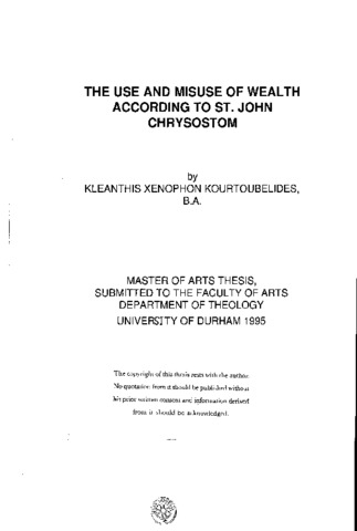 Today, when one is being constantly reminded that the cause of social justice is of the very essence of Christianity, it is important and helpful to reflect that this is not a new development in Christian teaching over the past hundred years, but has in fact solid roots in early Christian tradition. One of the strongest and most eloquent spokesmen for this demand for Christian responsibility and involvement in the issues of social justice is John Chrysostom, bishop, pastor, teacher and prophet in the Christian communities of Antioch and Constantinople in the latter part of the fourth century. By way of introduction, a brief survey of the Early Church’s attitude to wealth from its Gospel origins to the end of the third century is provided. Then follow three chapters: the first deals with the proper use of wealth, i.e. alms-giving and rich people as stewards of the poor. Chrysostom argued that some wealth is given by God to rich people, who in turn are to act as God’s stewards. Riches used in the service of other people are much more likely to be considered gifts from God while wealth that is ill-gotten or selfishly spent is usually thought to be permitted by God rather than specially provided. The second deals with Chrysostom's argument that rich people who abuse their wealth make the poor suffer. He observes says that their wealth is derived from dishonest business, the misfortune of others and taking interest on loans. Finally, in the third chapter, Chrysostom's teaching on the use and misuse of wealth in the light of the after-life are discussed. The third chapter also examines the arguments of those scholars who suggest that Chrysostom's works were either socialist or communist and concludes that they are neither.