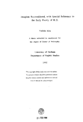 The main aim of this thesis is to examine how H. D. developed her poetics during the Imagist movement by looking especially at her work in the Imagist anthologies (1915-1917). In order to identify the distinctive qualities of H. D.'s poetry, I shall compare it with that of other Imagists, notably Richard Aldington, John Gould Fletcher, F. S. Flint and Amy Lowell. Previous discussions of H. D.'s early poetics have been held within the context of Ezra Pound's aesthetics, and the characteristics of her poems which are inconsistent with Pound’s criteria have been ignored. Hence, one of the most useful strategies to reinterpret H. D.'s poetry is, first and foremost to reconsider Pound's Imagist theory from a different viewpoint. Because of this, in the first half of this thesis, I will consider Imagism in respect of Japanese poetics; for as regards the relationship between Pound’s theory and the haiku and the Chinese ideograph, there are some important issues which have been hardly discussed. So, these issues provide room for reconsidering the formation of Imagism. Since H. D. left behind hardly any literary criticism, her poems are the most useful source from which to draw clarification of her poetic criteria. Moreover, her correspondence with Amy Lowell provides significant evidence for an examination of H. D.'s poetic practice at this time. In the second half of the thesis, by quoting her own words in letters to Lowell, I identify the characteristics of H.D.'s Imagism which obviously differ from Pound's theory, and trace her development within the Imagist period. By raising a number of critical issues, I intend to illuminate the diversity of Imagism.