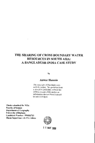 Over almost 25 years there existed an equitable water sharing problem between Bangladesh and India which has been partially resolved under the Ganga treaty signed in December 1996. The thesis analyzes this example of cross boundary water sharing using the existing literature and the data which is publicly available. The study covers the geo-physical background, the water disputes, the environmental impact on Bangladesh and the extent of known damage. In the process it also discusses the existing international legal regime and the efforts made by the United Nations on this subject. Finally, an attempt is made to highlight the present situation between Bangladesh and India and the possible future courses of action for sharing the other 53 international rivers. Short term and long term solutions to national and regional cross boundary water resource sharing and management are suggested.