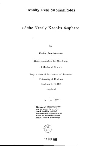 Totally real 3-dimensiunal submanifolds of the nearly Kaehler 6-sphere are the main topic of this thesis. Having introduced preliminaries on the theory of complex and almost complex manifolds, the nearly Kaehler structure of S(^6) and the non existence of almost complex. 4-dimensional submanifolds of the 6-sphere [G3], the results of N. Ejiri [Ejl] on orientability, minimality and characterization by means of constant sectional curvature are given. Results concerning the pinching of the sectional curvature in the compact case are coming next (see: [D.O.V.V.1]. [D.V.V2]). These results are obtained by using the integral formulae of .A. Ros [R]. formulae which play a crucial role in global Riemannian geometry. .After a discussion on a new Riemannian invariant δ. introduced by B.Y.Chen in [Ch2]. For submanifolds of real space forms and the inequality (which is the best possible) satisfied by S, we focus on the case where the inequality becomes an equality. In this case the shape operator of the immersion attains a special form and this helps with the classification. In particular, if M is a 3-dimensional totally real submanifold of S(^6) then the Chen's equality becomes δ(_M) = 2. and if M is assumed to be of constant scalar curvature, we classify M by two explicitely described immersions of S(^3) in S(^6). [C.D.V.Vl]. By assuming that the complementary distribution of a certain distribution of M is integrable. M is characterized in terms of a warped product of a minimal, totally real, non-totally geodesic surface immersion in S(^6). which lies linearly full in a totally geodesic S(^5) [C.D.V.V2]. Furthermore, with respect to totally real 3- dimensional submanifolds satisfying Chen's equality ([D.V]): if M is contained in a totally geodesic S(^5). then M can be classified in terms of complex curves in CP(^2)(4) lifted via the Hopf fibration. These submanifolds satisfy always Chen's equality. In case M lies linearly full in S(^6) and satisfies Chen's equality classification has been in terms of tubes of radius (^π)(_2) in the direction of the second normal space, over an almost complex curve. Finally, local converses of the last two results are proved.