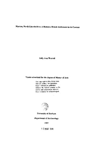 This thesis seeks to reconstruct and interpret the form and extent of the Romano- British settlement at Marton, North Lincolnshire. The site at Marton has previously been the subject of no formal programme of archaeological research. However it offers a rich potential for applying non-intrusive archaeological survey, and this study is based on the results obtained from a combination of different survey techniques. Although the site has received very little formal archaeological attention in the past, uncontrolled metal-detection has been intensive over recent years. The unrecorded leaching of material, coupled with the diverse range of artefacts known to have been retrieved in detection has been one of the principal catalysts behind the adoption of this survey. The data was collected both from previous aerial photographic surveys and metal detectorists with whom a working relationship had been established, and in geophysical survey and field walking undertaken by the author. Survey methodology and the results of the different components of the survey are presented in chapters 2 to 6. Initial interpretations of the features identified from the aerial photographic and geophysical survey are proposed and the main chronological and spatial trends m the distribution of pottery, coins and other small finds are summarised. Chapter 7 compares the results obtained from the different classes of evidence and refines the interpretations offered for the development of the site through time and space. Specific issues considered are the origins of the settlement, its internal organisation and extent and its relationship with nearby Littleborough. The final chapter compares Marton with other sites in the region and sites of a similar type in Roman Britain. A series of hypotheses are then proposed concerning the nature of the site and its function and evolution in its local landscape.