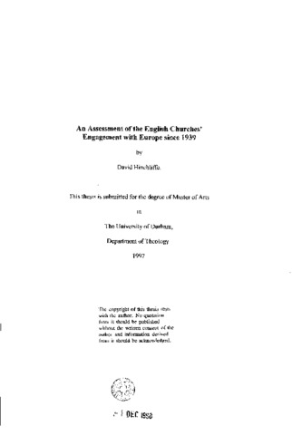 The aim of my thesis is to offer an assessment of the English Churches' engagement with Europe since 1939. My first two chapters set the context for the Churches' engagement with the European union by outlining the principal European political developments and issues since 1939.In chapters 3 and 4, I assess the key Christian contributions since 1939. Chapter 3 focuses on the thinking of Bishop Bell, Archbishop Temple and A.C.F. Beales; as well as the contributions to the debate made by 'Sword of the Spirit’, The Tablet newspaper, and the 1967 British Council of Churches’ report. Christians and the Common Market. My fourth chapter concentrates on the developments in English ecclesiastical engagement with Europe since 1973. I analyse the official denominational reports published since the late 1980's, together with other church publications, such as those contained within church newspapers, theological journals and essays. I also assess the particular contributions made by Cardinal Hume, David Edwards and Philip Ludlow. In chapter 5, having highlighted the deficiency of English ecclesiastical engagement with Europe in previous chapters, my 'diamond model' describes ways in which individual Christians, the Churches as institutions, and theology can play a role in responding to the situation. In particular I explore the implications of the doctrine of the priesthood of all believers as it may relate to Europe; as well as the need to re-affirm a theology of Community for Europe. It is my argument that a multi-faceted approach needs to be employed if the Churches are effectively to engage with Europe in the future. This inevitably means that far greater personnel, financial, and theological resources must be given by the Churches, if Europe is to be taken seriously in the future. It remains to be seen whether the English Churches are sufficiently committed
