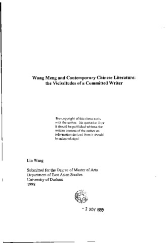 This thesis examines the way Wang Meng has developed as a writer from the 1950s to the 1990s in the context of New China's political and literary background. It looks at the compromises he was forced to make between his political beliefs in the Communist Party and his chosen role as a professional writer. After his disastrous early foray into what was deemed to be unacceptable political criticism with The Young Newcomer in the Organisation Department in the 1950s, when the opportunity came to start publishing again in the late 1970s he was boldly innovative in style, helping to transform New Period literature, but conservative in content, sticking to politically acceptable topics. It was only with Hard Porridge in 1989 that he ventured again, and very successfully, into political comment. There is no outstanding leading writer in contemporary China, but Wang Meng is a leading contender for the title.