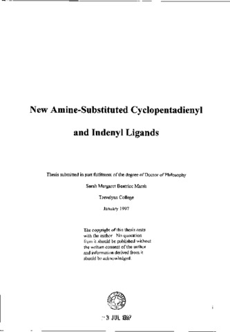 This thesis concerns the new amine-substituted cyclopentadiene and indene ligands C(_5)H(_5)(CH(_2))(_3)N((^t)Bu)H and C(_9)H(_7)(CH(_2))(_3)N((^t)Bu)H which can co-ordinate to a metal through all five carbon atoms of the five-membered ring (η(^5)) and/ or through the nitrogen (σ). Chapter 1 reviews the recent literature concerning Lewis-base functionalised cyclopentadienyl and indenyl ligands and their compounds with s-, p-, d- and f-block metals. Chapter 2 contains a brief review of possible synthetic routes to amine-substituted cyclopentadienyl and indenyl ligands with some examples from the recent literature, and a detailed account of the synthesis of C(_5)H(_5)(CH(_2))(_3)N((^t)Bu)H and C(_9)H(_7)(CH(_2))(_3)N((^t)Bu)H. The amino alcohol (^t)BuNH(CH(_2))(_3) OH was synthesised by the conjugate addition of (^t)BuNH(_2) to ethyl acrylate and reduction of the product ester (^t)BuNH(CH(_2))(_2)C0(_2)Et using LiAIH(_4). (^t)BuNH(CH(_2))(_3)OH was converted into (^t)BuNH(CH(_2))(_3)Br.HBr and (^t)BuNH(CH(_2)(_3)Cl.HCl by reaction with HBr or SOCI(_2). Reaction between (^t)BuNH(CH(_2))(_3)C1.HC1 and two equivalents of Na(C(_5)H(_5)) gave C(_5)H(_5)(CH(_2))(_3)N((^t)Bu)H in good yield. Treatment of (^1)BuNH(CH(_2))(_3)C1.HC1 with excess NaOH followed by reaction with Li(C(_9)H(_7)) gave C(_9)H(_7)(CH(_2))(_3)N((^t)Bu)H, also in good yield. Chapter 3 describes the synthesis of various main group and iron compounds of C(_5)H(_5)(CH(_2))(_3)N((^t)Bu)H and C(_9)H(_7)(CH(_2))(_3)N((^t)Bu)H. Lithium salts Li[C(_5)H(_4)(CH(_2))(_3)N((^t)Bu)H], Li[C(_5)H(_4)(CH(_2))(_3)N((^t)Bu)]Li, Li[C(_9)H(_6)(CH(_2))(_3)N((^t)Bu)H] and Li[C(_9)H(_6)(CH(_2))(_3)N((^t)Bu)]Li were prepared for use as reactive intermediates and Li[C(_5)H(_4)(CH(_2))(_3)N((^t)Bu)H] was characterised as its THF-adduct by (^t)H NMR spectroscopy. The silyl derivatives (Me(_3)Si)C(_5)H(_4)(CH(_2))(_3)NH(^t)Bu and (Me(_3)Si)C(_5)H(_4)(CH(_2))(_3)N((^t)Bu)SiMe(_3) were synthesised and characterised by NMR spectroscopy, and (Me(_3)Si)C(_9)H(_6)(CH(_6))(_3)N((^t)Bu)H and (Me(_3)Si)C(_9)H(_6)(CH(_2))(_3)N((^t)Bu)(SiMe(_3)) were also synthesised. The anune-substituted ferrocene Fe(_2) was synthesised and oxidised to the corresponding ferricenium ion which was isolated as its PF(_6)(^-) salt. Exploratory work was carried out into the preparation of heterobimetallic species by reaction between Fe