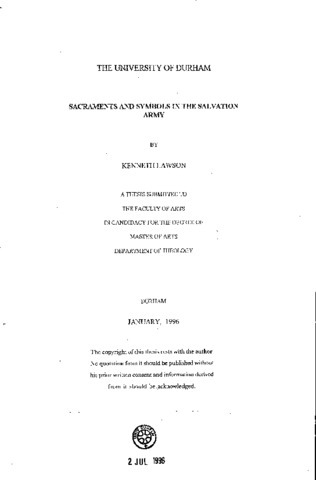 This work seeks to trace the attitude of The Salvation Army to sacraments and symbols from its early sacramental period (1865-1883) and then from 1883 to the present day, a longer time during which formal sacraments have not been used in Army worship. The thesis consists of seven main chapters, plus an introduction and conclusion. It contains a critical examination of the historical origins of the Army's non-sacramentalism and the debate which has arisen about earlier historical influences on the Army, including various Reformers, the Quakers and the Methodists. Some of the Army's own published works defending its non-sacramentalism are also examined in detail. Chapters dealing with the developing spirituality within The Salvation Army; the introduction of its own symbols into its organisation and worship, and the emphasis which has been placed on holiness are all included. There is also a discussion of the present state of debate amongst Salvationist regarding the possible re- introduction of the sacraments into its worship. The aim of this thesis is to demonstrate that, though the Army formally abolished the sacraments in 1883, in actual practice through the extensive use of symbolism, sacramental ideas have continued to exercise a profound influence and it is therefore being inconsistent with itself in its unqualified opposition to the use of the sacraments in its worship. This viewpoint is richly illustrated by examples both from the literature of the Army and from accounts of personal experience (both of myself and others). Some of my informants have asked for their names not to be disclosed; otherwise frill documentation is provided. Careful consideration is also given to possible influences of sacramental spirituality on the Army; also on its own developing spirituality - particularly as it relates to the question of holiness teaching.