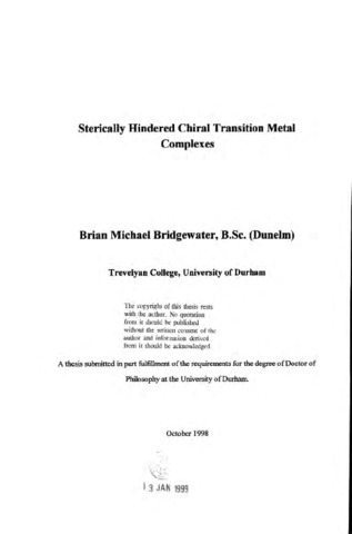 This thesis describes the synthesis, characterization and study of a series of organometallic compounds which all contain the same new ligand, l-phenyl-3-methyl-4,5,6,7-tetrahydroindenyl. The ligand forms a chiral complex once coordinated, and is relatively bulky when compared with ligands such as cyclopentadienyl or 4,5,6,7-tetrahydroindenyl.Chapter one of this thesis introduces cyclopentadienyl ligand chirality, cyclopentadienyl metal complex chirality and sterically demanding cyclopentadienyl systems. The synthesis and chemistry of tetrahydroindenes and some applications of chiral cyclopentadienyl metal complexes and their bulky analogues are also reviewed. Chapter two describes modifications to a literature preparation of the tetrahydroindenone precursor of the new tetrahydroindenyl ligand which lead to higher yields. The synthesis of the ligand itself is described, as well as the synthesis of a benzylidene-substituted hexahydroindene, which demonstrates a limitation in the flexibility of the synthetic route chosen. The synthesis, characterization and various properties of the following iron(II) compounds are discussed in chapter two; bis-l-phenyl-3-methyl- 4,5,6,7-tetrahydroindenyl iron (II), 2.3, l-phenyl-3-methyl-4,5,6,7-tetrahydroindenyl iron(II) dicarbonyl dimer, 2.4, and l-phenyl-3-methyl-4,5,6,7-tetrahydroindaiyl methyl dicarbonyl iron(II), 2.5. For all these iron complexes, the solid state molecular structures and the absolute configuration of the chiral ligand were determined using single crystal X-ray d iffraction. For 23 and 2.4, three isomers are possible, two enantiomers that are collectively termed the rac-isomer and a third isomer, the meso- isomer. Cyclic voltammetric studies on 2.3 indicate that it has a reversible one electron oxidation at 0.187 V (with respect to a non-aqueous Ag/AgCl standard electrode). The difference between this and the reversible one electron oxidation for (η-C(_5)H(_5))(_2)Fe (with respect to the same standard) is -0.314 V, therefore 2.3 is shown to be much more easily oxidized than (η-C(_5)H(_5))(_2)Fe. The solution-state infi-a-red spectrum of 2.4 is explained, with reference to a literature analysis of the unsubstituted analogue [CpFe(CO)(_2)](_2). The steric forces present in the various molecular environments are discussed in connection with the degree of phenyl-ring tilt relative to the cyclopentadienyl mean plane and the deviation of the other cyclopentadimyl substituents away from the metal centre. Subsequent reactions of compounds 2.4 and 2.5 are described. Attempts to make linked analogues of the new ligand are summarized in chapter two. In chapter three, two Zr(rV) compounds are prepared, bis (l-phenyl-3-methyl-4,5,6,7-tetrahydroindenyi) zirconium(fV) dichloride, 3.1, and bis (l-phenyl-3-methyl-4,5,6,7-tetrahydroindenyl) dimethyl zirconium(TV), 3.2. Upon crystallization, rac-3.1 spontaneously resolves into crystals containing only one enantiomer. The similarities and differences in the spectroscopic data for the iron(n) compounds of chapter two and the zirconium(IV) compounds of chapter three are discussed and possible explanations offered . The solid state molecular structures of 3.1 and 3.2 were determined by single crystal X-ray diffraction. Experimental details are given in chapter four, whilst the characterizing data are presented in chapter five. Details of the X-ray structure determinations are given in Appendix A.