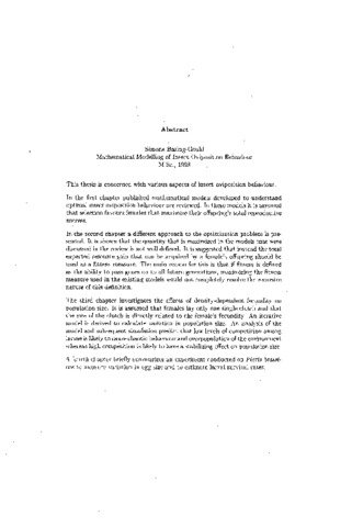 This thesis is concerned with various aspects of insect oviposition behaviour. In the first chapter published mathematical models developed to understand optimal insect oviposition behaviour are reviewed. In these models it is assumed that selection favours females that maximize their offspring's total reproductive success. In the second chapter a different approach to the optimization problem is presented. It is shown that the quantity that is maximized in the models that were discussed in the review is not well defined. It is suggested that instead the total expected resource gain that can be acquired by a female's offspring should be used as a fitness measure. The main reason for this is that if fitness is defined as the ability to pass genes on to all future generations, maximizing the fitness measure used in the existing models would not completely resolve the recursive nature of this definition. The third chapter investigates the effects of density-dependent fecundity on population size. It is assumed that females lay only one single clutch and that the size of the clutch is directly related to the female's fecundity. An iterative model is derived to calculate variation in population size. An analysis of the model and subsequent simulation predict that low levels of competition among larvae is likely to cause chaotic behaviour and overpopulation of the environment whereas high competition is likely to have a. stabilizing effect on population size. A fourth chapter briefly summarizes an experiment conducted on Pieris brassi-cae to measure variation in egg size and to estimate larval surviral rates.