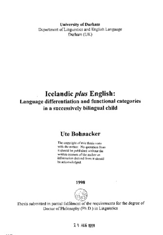 This thesis investigates the formal and functional properties of the linguistic knowledge of a young bilingual child 'Katla' who successively acquires Icelandic (L1, from birth) and English (L2, from age 1:3). I present new longitudinal natural speech data which I collected in both Icelandic and English from Katla at regular intervals. Audio-recordings were made roughly three times per month at age 1 ;0-4;7 and transcribed in adapted CHILDES/CHAT format. Using a generative framework, I analyse Katla's data qualitatively and quantitatively, focusing on her morphology and syntax during the period 1;6-3;6: determiners and word order in nominals, copula constructions, progressive constructions, imperatives, negation, verb placement, verb inflections, auxiliaries, and periphrastic do. Katla's development is compared with monolingual English-speaking and Icelandic-speaking children, and, where applicable, with other bilinguals. Particular attention is paid to early grammar differentiation and cross- language influence, and to the relationship between child language and input (construction types and frequencies). The empirical results are evaluated in the light of current theories of language acquisition and generative approaches to syntax. Katla's first multi-word combinations (1;6) show productive use of functional morphology (determiners, copulas). Early on, there is evidence of movement into the DP, IP and CP domains, indicating continuity of these functional categories. Moreover, translational equivalents, language-specific functional morphemes and language-specific word orders in Katla's Icelandic and English bear evidence of early language differentiation in successive child bilingualism. The longitudinal development of morpho-syntax largely progresses along separate lines for Katla's two languages; there is no cross- language influence as regards head parameter and movement parameter settings. Some construction transfer occurs where L1 and L2 linear orders are similar. Ensuing implications for transfer and (de)learnability are addressed.