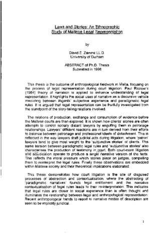 This thesis is the outcome of anthropological fieldwork in Malta, focusing on the process of legal representation during court litigation. Paul Ricoew's (1984) theory of narration is applied to enhance understanding of legal representation. It highlights the social uses of narrative as a discursive vehicle mediating between litigants' subjective experience and paradigmatic legal rules. It is argued that legal representation can be fruitfully investigated from the standpoint of the story-telling relations involved. The relations of production, exchange and consumption of evidence before the Maltese courts are then explored. It is shown how clients' stories are often attempts to control socially distant lawyers by engulfing them in patronage relationships. Lawyers' diffident reactions are in turn derived from their efforts to balance between patronage and professional ideals of detachment. This is reflected in the way lawyers draft judicial acts during litigation, where 'patron’ lawyers tend to give most weight to the subjunctive stories' of clients. This same tension between paradigmatic legal rules and subjunctive stories' also characterises the production of testimony in court. Both court-room litigation and adjudication operate to produce a single narrative version of the facts. This reflects the moral pressure which stories place on judges, compelling them to reinterpret the legal rules. Finally these observations are embedded within Maltese society and their theoretical implications elaborated. This thesis demonstrates how court litigation is the site of disguised processes of abstraction and contextualisation, where the abstracting of 'paradigmatic narratives' founds legal entitlement and the narrative contextualisation of legal rules leads to their re-interpretation. This indicates that legal rules are closer to social experience than is often thought and illuminates the relationship between legal and anthropological representation. Recent anthropological trends to resort to narrative modes of description are seen to be implicitly juridical.