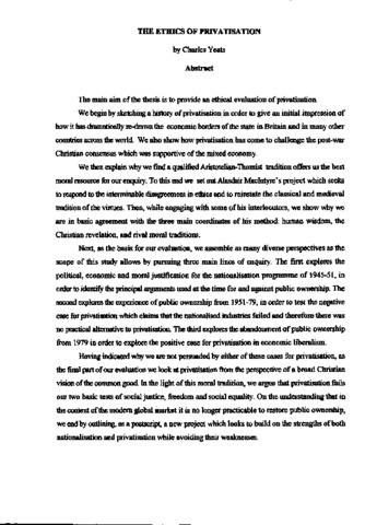 The main aim of the thesis is to provide an ethical evaluation of privatisation. We begin by sketching a history of privatisation in order to give an initial impression of how it has dramatically re-drawn the economic borders of the state in Britain and in many other countries across the world. We also show how privatisation has come to challenge the post-war Christian consensus which was supportive of the mixed economy. We then explain why we find a qualified Aristotelian-Thomist tradition offers us the best moral resource for our enquiry. To this end we set out Alasdair MacIntyre's project which seeks to respond to the interminable disagreement in ethics and to reinstate the classical and medieval tradition of the virtues. Then, while engaging with some of his interlocutors, we show why we are in basic agreement with the three main coordinates of his method: human wisdom, the Christian revelation, and rival moral traditions. Next, as the basis for our evaluation, we assemble as many diverse perspectives as the scope of this study allows by pursuing three main lines of enquiry. The first explores the political, economic and moral justification for the nationalisation programme of 1945-51, in order to identify the principal arguments used at the time for and against public ownership. Second explores the experiences of public ownership from 1951-79. in order to test the negative case for privatisation which claims that tin nationalised industries failed and therefore there was no practical alternative to privatisation The third explores the abandonment of public ownership from 1979 in order to explore the positive case for privatisation in economic liberalism. Having indicated why we are not persuaded by either of these cases for privatisation, as the final part of our evaluation we look at privatisation from the perspective of a broad Christian vision of the common good. In the light of tins moral tradition, we argue that privatisation fails our two basic tests of social justice, freedom and social equality. On the understanding that in the context of the modem global market it is no longer practicable to restore public ownership, we Old by outlining, as a postscript, a new project which looks to build on the strengths of both nationalisation and privatisation while avoiding their weaknesses.