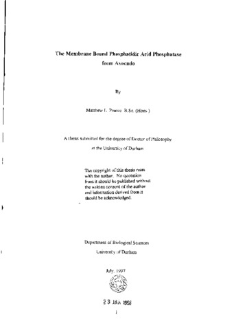 Phosphatidate Phosphatase (EC 3.1.3.4) is an important enzyme in plant lipid metabolism as it lies at a theoretical branchpoint between phospholipid and triacylglycerol biosyntheses. Since it's identification in 1955, it has received very little attention in plant lipid research. Previous studies reported in the literature have been limited to the use of crude plant cell extracts, making an accurate evaluation of the data difficult. The enzyme was characterised and purified to homogeneity from the microsomes of maturing avocado fruit, for the first time from any plant source. The novel procedure utilised detergent solubilisation in CHAPS, followed by anion exchange and Affi-Gel Blue chromatography, ammonium sulphate precipitation and Phenyl Superose chromatography. The enzyme had a subunit molecular mass, as determined by SDS-PAGE of 49kDa. Gel filtration studies revealed it was monomeric. Enzyme activity had a pH optimum of 6.0, was insensitive to N- ethylmaleimide and was stimulated by Mg(^2+). The homogenous enzyme was examined for the ability to hydrolyse sn-1,2- dioleoylglycerol-3-phosphate(PA), sn-1 -oleoylglycerol-3 -phosphate(LPA), sn-2- oleoylglycerol-3-phosphate, ceramide-1-phosphate and p-nitrophenylphosphate. All substrates were used, but the apparent V(_MAX) values for PA and LPA were considerably higher than the other substrates tested. The Michaelis-Menten kinetic model of enzyme catalysis was found to be inappropriate as the surface active enzyme was shown to be dependent on the bulk and surface concentration of the substrate in Triton X-100 mixed micelles. The surface dilution kinetic model was used to study PA and LPA hydrolysis. LPA was a better substrate and was also a potent competitive inhibitor of PA hydrolysis. Considering the specificities of the other enzymes in triacylglycerol biosynthesis, this premature dephosphorylation of LPA would prevent triacylglycerol formation. These findings possibly indicate that strict metabolic channelling is in operation with very low steady state concentrations of LPA with respect to PA, thus preventing any interaction with LPA in vivo.