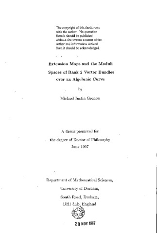 Let SUc(2,Ʌ) be the moduli space of rank 2 vector bundles with determinant Ʌ on an algebraic curve C. This thesis investigates the properties of a rational map PU(_d,A) →(^c,d) SUc(2, A) where PU(_d,A) is a projective bundle of extensions over the Jacobian J(^d)(C). In doing so the degree of the moduli space SUc(2, Oc) is calculated for non- hyperelliptic curves of genus four (3.4.2). Information about trisecants to the Kummer variety K C SUc(2,Oc) is obtained in sections 4.3 and 4.4. These sections describe the varieties swept out by these trisecants in the fibres of PU1,o(_c) → J(^1)(C) for curves of genus 3, 4 and 5. The fibres of over ϵ(_d) over E ϵ SUc{2,A) are then studied. For certain values of d these correspond to the family of maximal line subbundles of E. These are either zero or one dimensional and a complete description of when these families are smooth is given (5.4.9), (5.4.10). In the one dimensional case its genus is also calculated (if connected) (5.5.5). Finally a correspondence on the curve fibres is shown to exist (5.6.2) and its degree is calculated (5.6.5). This in turn gives some information about multisecants to projective curves (5.7.4), (5.7.7). [brace not closed]
