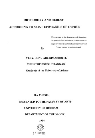 Heresy and Orthodoxy have been much discussed terms in theological studies from ancient times to the present day and various opinions and beliefs have been expressed on them. In this thesis, we have tried to gather the thought of Epiphanius on these terms on the basis of his works Panarion and Angyrotos. We have tried to let the texts of our author lead us to clear conclusions and this has meant that we made extensive use of the writings under examination. In this effort we are conscious that we have stood closer to Epiphanius' own methodology, namely his use of relevant texts, whereby the historical continuity of the faith of the Church, which lies at the root of her experience, is more adequately exposed. The thesis comprises three parts, dealing consecutively with a) Epiphanius' life and work, b) Epiphanius' views of Heresy and c) Epiphanius' views of Orthodoxy. In part a) we provide a brief account of Epiphanius' person and historical context, as well as his perception concerning his heresiology. In part b) we explore Epiphanius' sources for his account of heresy, his methodology, as well as his views on such central topics as the beginnings and development of heresy, the difference between schism and heresy, truth and heresy, church and heresy. Scripture and heresy, the devil and heresy and, finally the meaning of heresy suggested by the appelations which Epiphanius uses in his descriptions of it. In part c) we provide a general introduction on Epiphanius' understanding of orthodoxy, an account of the presuppositions of orthodoxy and the main contents of the orthodox faith as Epiphanius expounds them which comprise the topics of Theology/Triadology, Christology and Ecclesiology. In our conclusion we stress that, according to St. Epiphanius, Orthodoxy is the divinely provided and regulated truth which precedes the ecclesiastical life of the community and is expressed via all the manifestations of this life. By the same token. Heresy is any deviation from this divine and primordial truth as appropriated through and manifested in ecclesiastical life. As far as priority goes in respect to Orthodoxy and Heresy Epiphanius' view is contrary to that of Walter Bauer. For Epiphanius Orthodoxy precedes Heresy. The difference between these two views seems to lie in their choice of context. Bauer explores his topic in the context of historical and 'scientific' methods to which he subordinates his ecclesiastical data. Epiphanius develops his topic in the context of ecclesiastical tradition and life without neglecting the historical and scientific data. In Epiphanius' view ecclesiastical life and history do not constitute a field of fuction and confrontation between diverse ideologies and interpretations. Rather they constitute a living and unbreakable foundation of orthodoxy, which is expressed in the theory and practice of the Church.