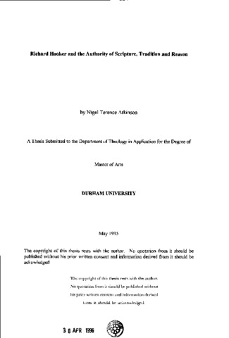 Richard Hooker and the authority of scripture, tradition and reason