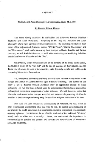 This thesis closely examined the similarities and differences between Friedrich Nietzsche and Asian Philosophy. Surprising as this may be, Nietzsche and Asian philosophy share many common philosophical patterns. By examining Nietzsche's main points of his philosophical discourse; such as "Will to Power", "Eternal Occurrence", and the "Übermensch" ideal, whilst comparing these concepts to Hindu, Buddhist and Taoism concepts; we will find that there are, as well, often contrasting and conflicting definitive conclusions between Nietzsche and the "East". Nevertheless, certain similarities such as the concepts of the Hindu Caste system, the Buddhist notion of the "non-self" and the role of language in their religion, and the Taoist role of nature, to name a few examples, make this study a useful and viable one in comparing Nietzsche to these notions. Yet, one cannot assume that the many parallels found between Nietzsche and Asian thought are a result of Eastern influence upon Nietzsche's thinking. The purpose of this study is not to discover whether Nietzsche knew an appreciable amount of Asian philosophy - in fact this thesis is based upon the understanding that Nietzsche reached his philosophical conclusions independent of Asian influence. We will, however, notice that Nietzsche used several Asian concepts as models and metaphors in promoting his ideas in an effort to break through and sweep away the social and religious institutions of his time. This study will also enhance our understanding of Nietzsche, the man, whom is often misconstrued as something other than what he was. In gaining an understanding of our place in the world, sometimes it is important to attempt to comprehend even seemingly opposing opinions. For Nietzsche, in his effort to break out of the traditional "Western” world, such an effort was a necessity. Hence, one understands the importance in contemplating the parallels and patterns, and contrasts and contradictions of Nietzschean and Asian philosophy.