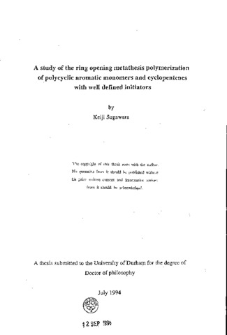 This thesis describes studies into the ring opening metathesis polymerisation (ROMP) of polycyclic aromatic monomers and cyclopentenes. Chapter 1 reviews general aspects of ring opening metathesis polymerisation of relevance to the themes of this thesis. Chapter 2 describes the synthesis of polycyclic aromatic monomers, the endo and the exo Diels-Alder adducts of acenaphthylene and cyclopentadiene. Chapter 3 reports a study on the polymerisation of these monomers using well defined initiators and classical catalyst systems. Chapter 4 describes the synthesis of a substituted cyclopentene. Chapter 5 reports an investigation of polymerisation of cyclopentene using a variety of well defined initiators of general formula M(=NAr)(- OR)(_2)(=CHR) where M=Mo or W. Chapter 6 presents a study on the polymerisation of a substituted cyclopentene, 4-methylcyclopentene, using a series of well defined initiators, and the characterisations of the polymers obtained using infrared, (^1)H, and (^13)C n.m.r. spectroscopy, differential scanning calorimetry, and gel permeation chromatography and an analysis of detailed microstructure with respect to meso/racemic configurations in the polymer chain. Finally, Chapter 7 summarises the conclusions and makes some suggestions for future work.